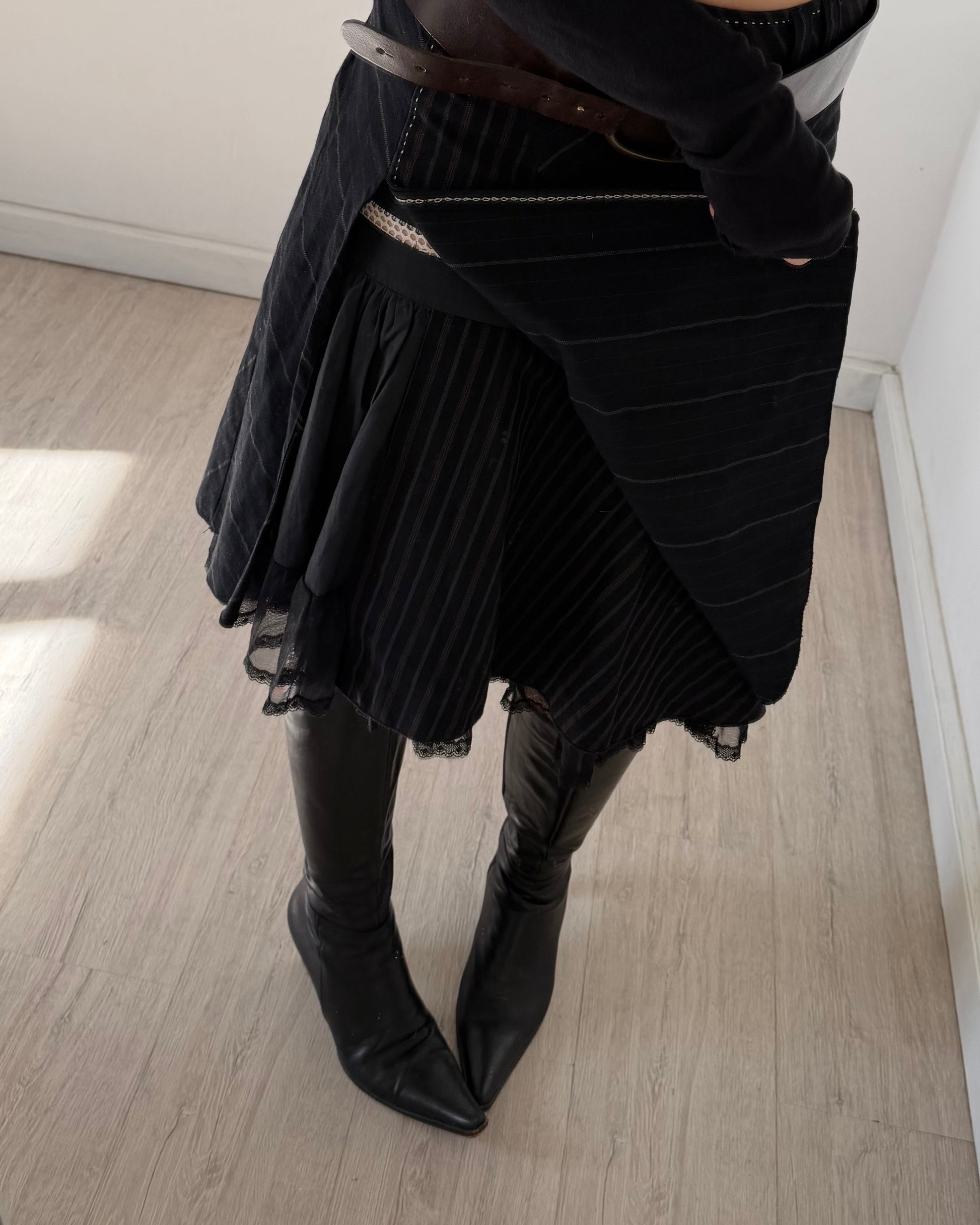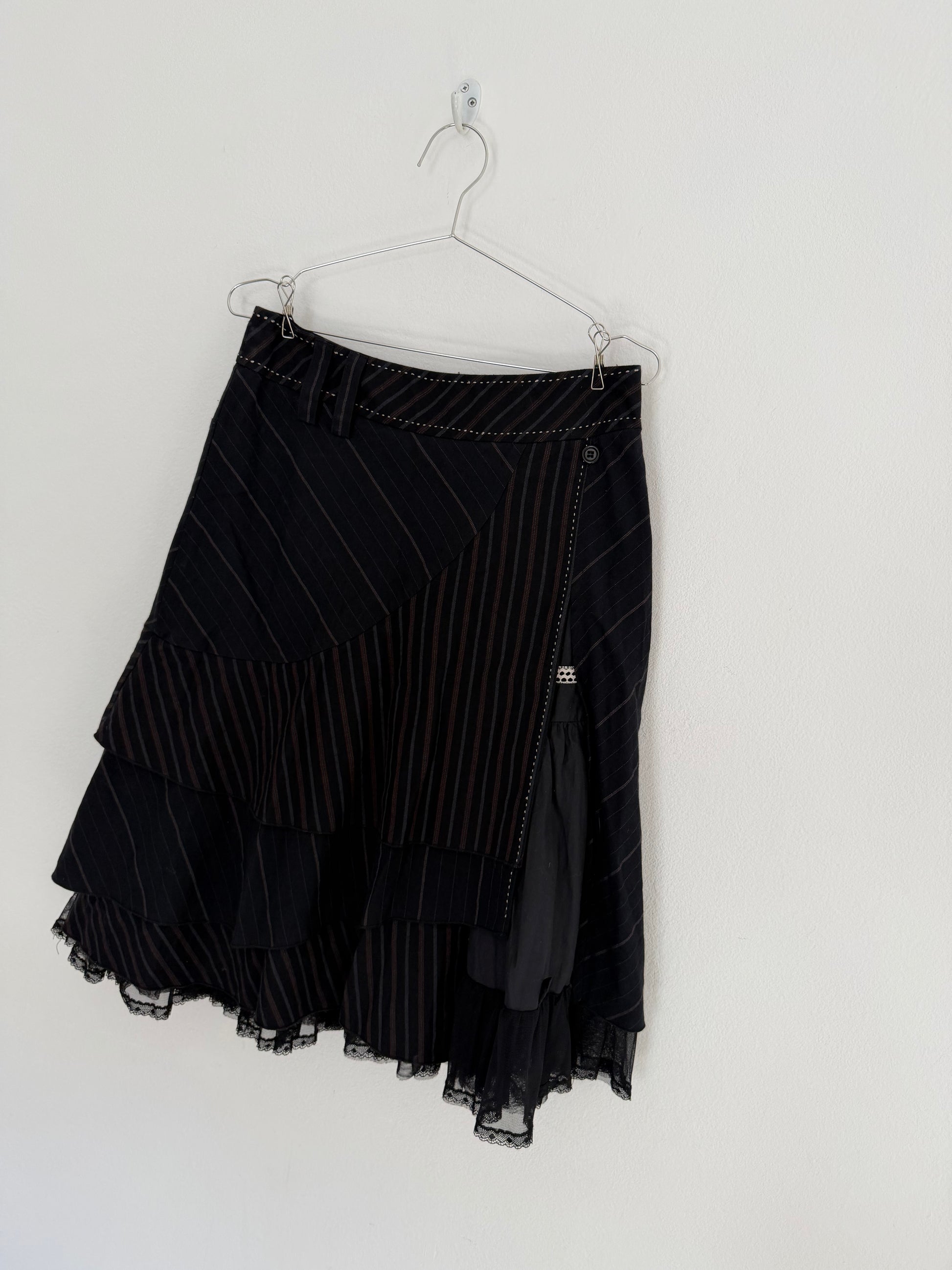 Meravigliosa gonna midi anni 2000 a strati in misto seta e cotone, taglio svasato con strati sovrapposti, ruches vaporose in tulle, ricami in cotone e cuciture a contrasto sulla vita, dettagli in lana/seta, tessuto gessato, vita media, zip laterale nascosta. Ogni dettaglio di questa gonna è perfetto, qualità favolosa.