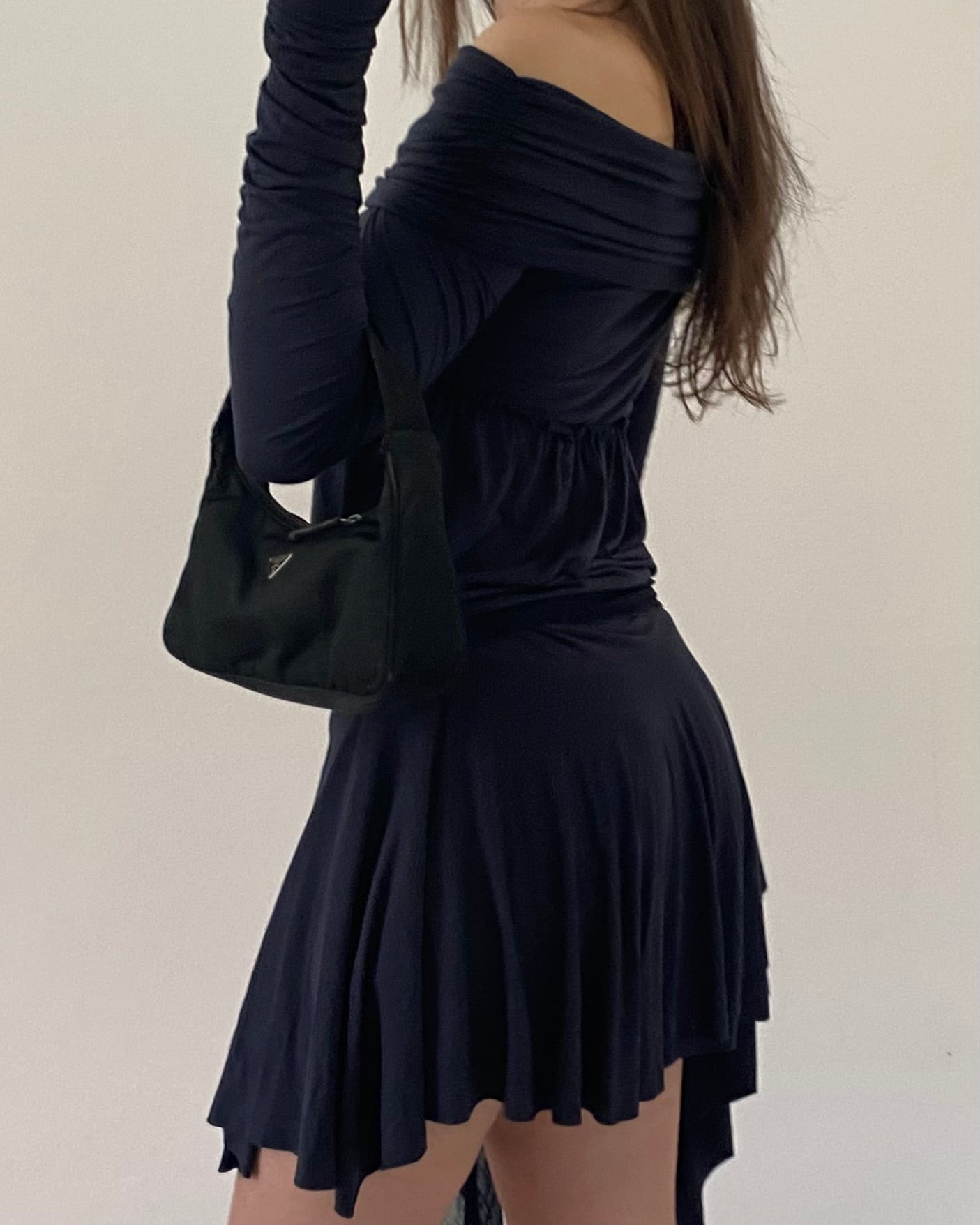 Meraviglioso abito primi anni 2000 in morbido jersey con collo ampio, gonna drappeggiata con orlo asimmetrico, morbida fascia in vita per regolare dove cade la vita e lungo nastro in organza da annodare sui fianchi o da far cadere scenograficamente lungo la gamba. Può essere indossato con le spalle scoperte o con il drappeggio sulla scollatura.