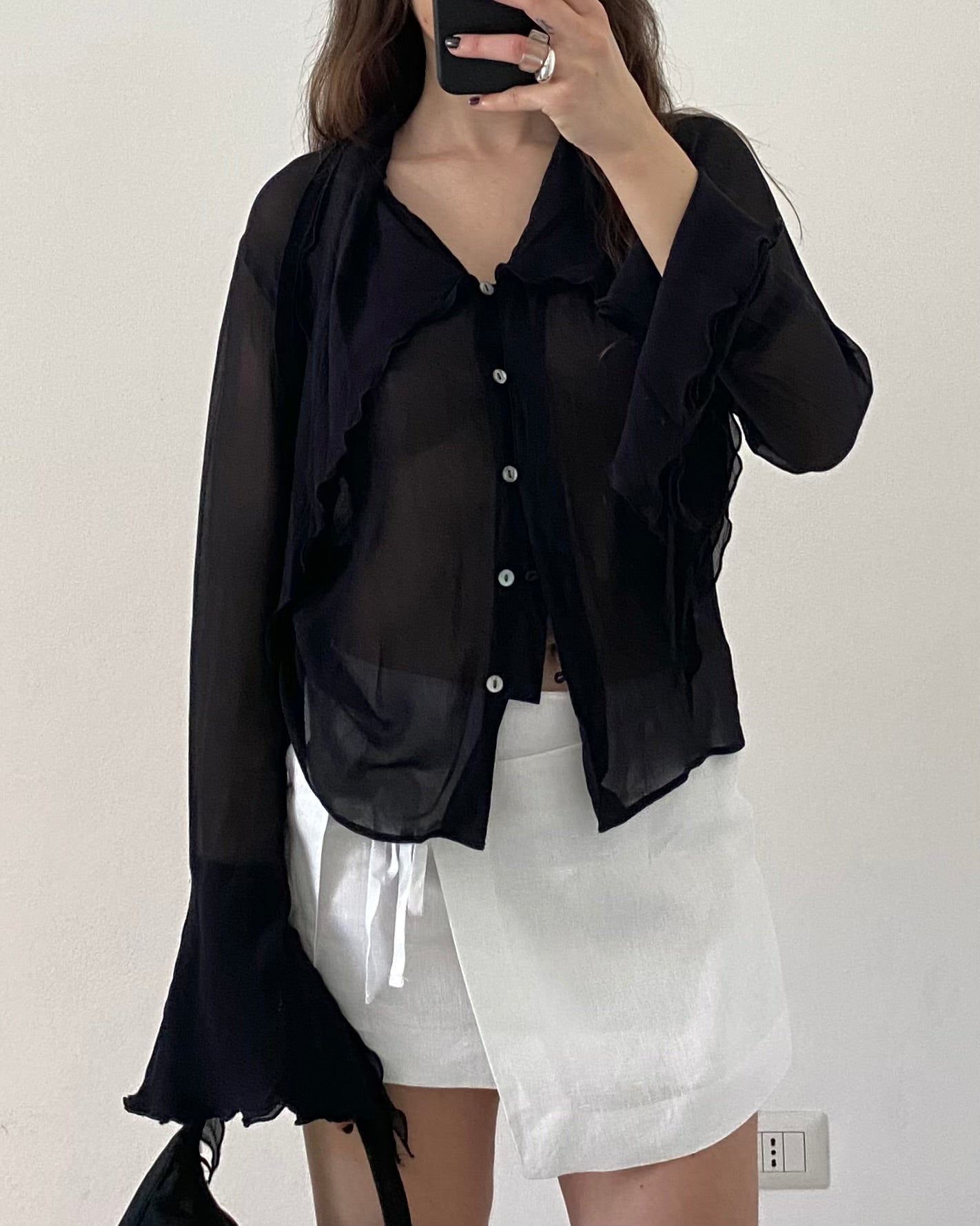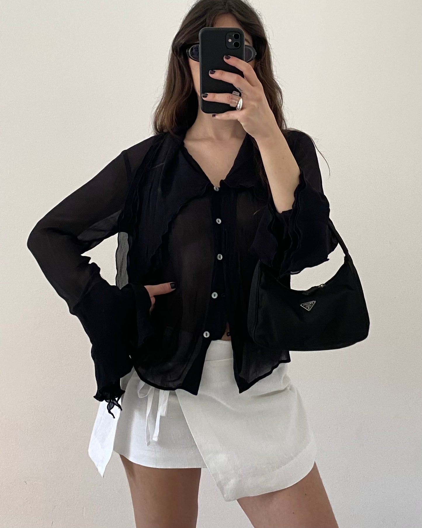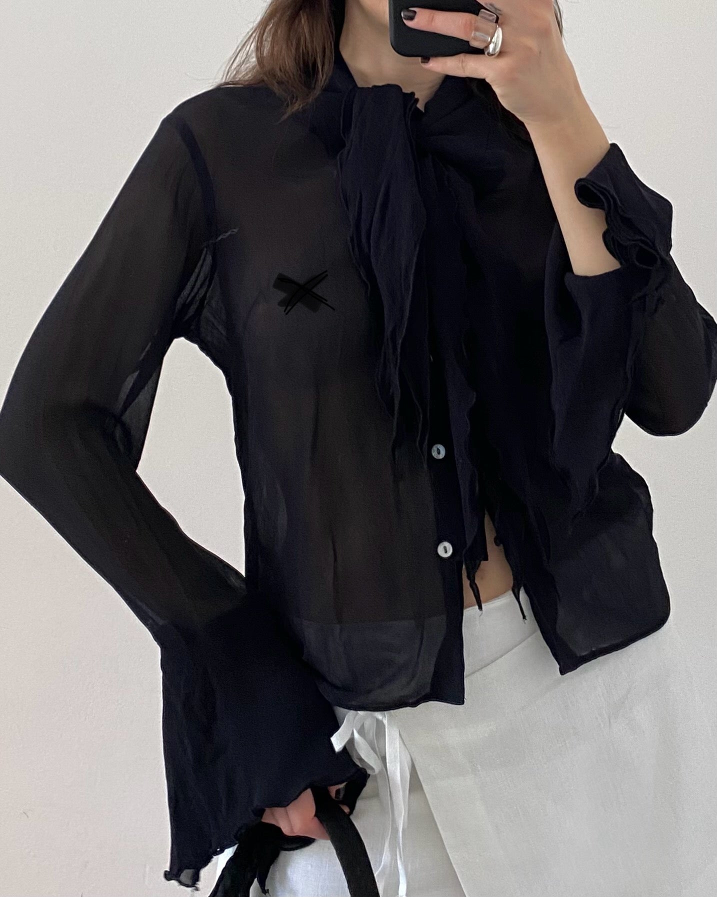 Camicetta in pura seta con colletto ampio con volants e maniche svolazzati, semi trasparente, collezione primi anni 2000 "evenement" della Rinascente.