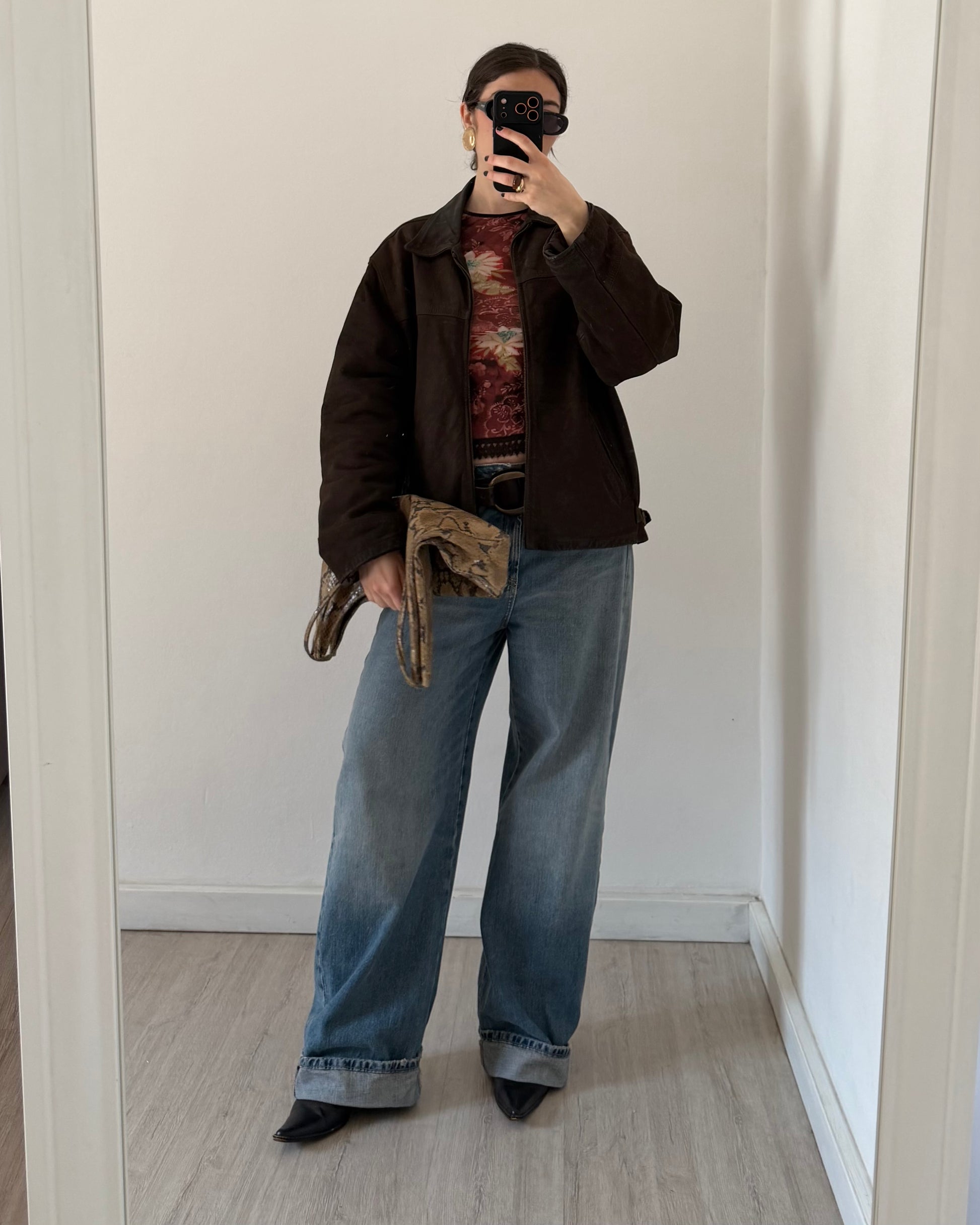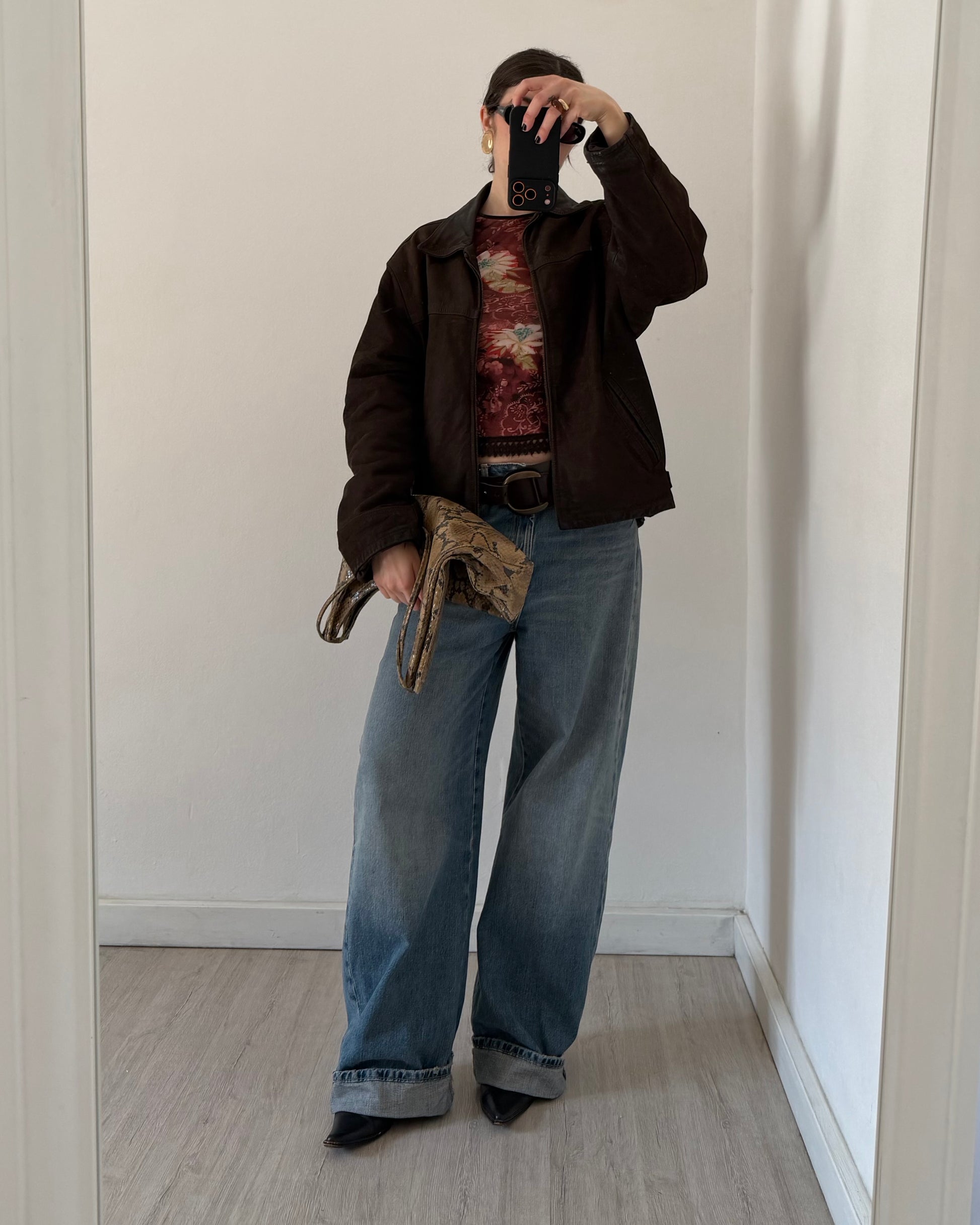 Brown distressed leather bomber jacket