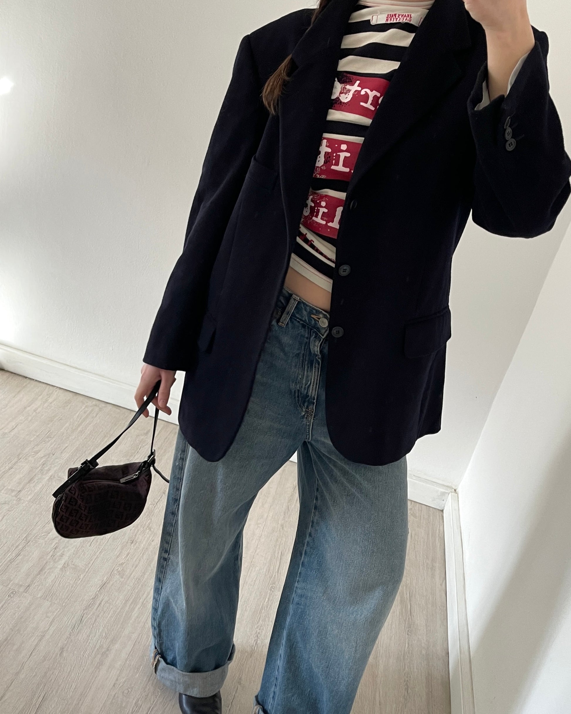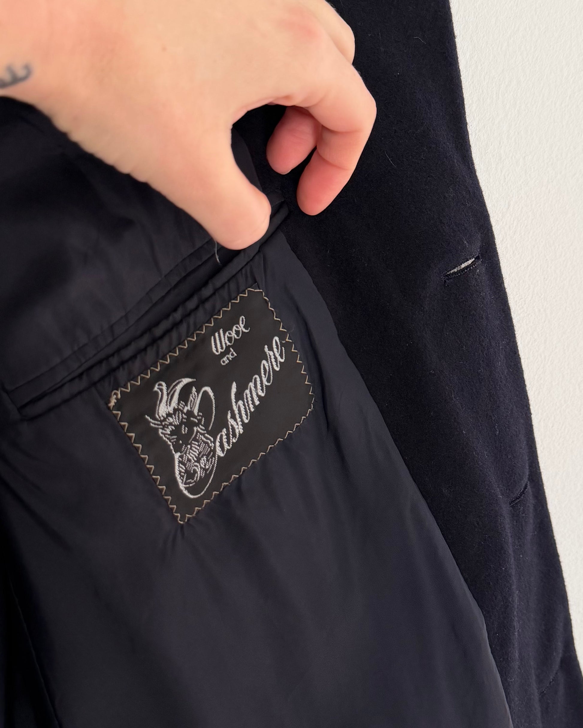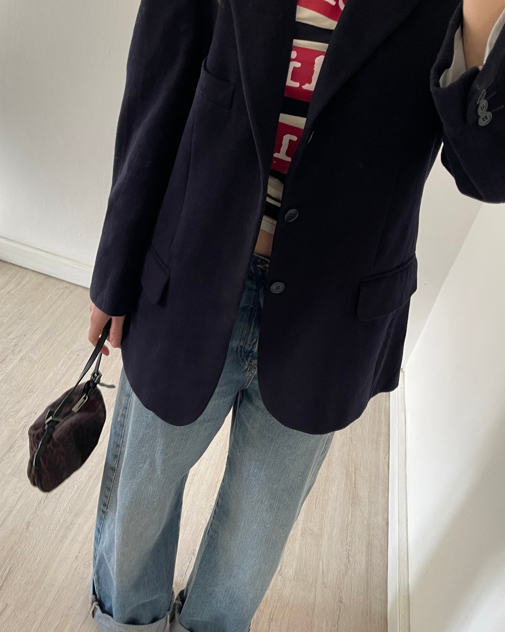 Blazer sartoriale vintage in lana vergine con % di cashmere, fodera interna con taschine, colore blu scurissimo. Nasce originariamente come capo "maschile", ma non risulta rigido/strutturato o oversize. Essenziale nel guardaroba.