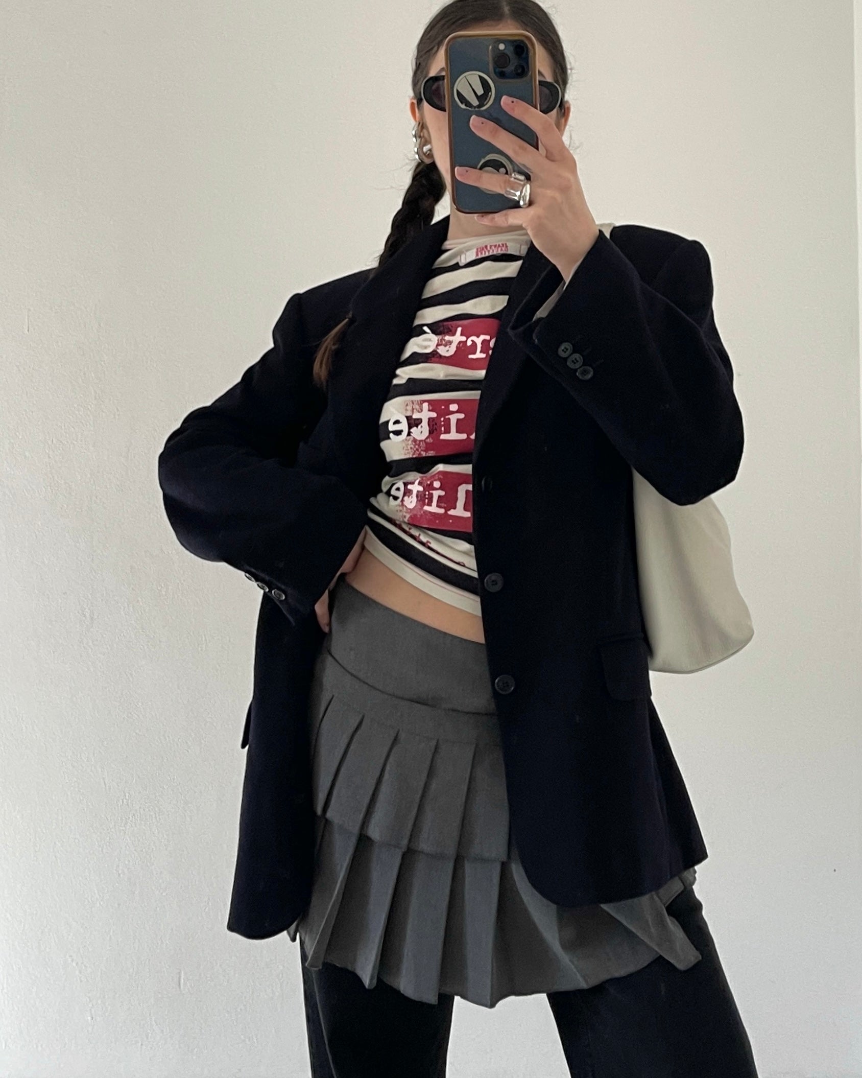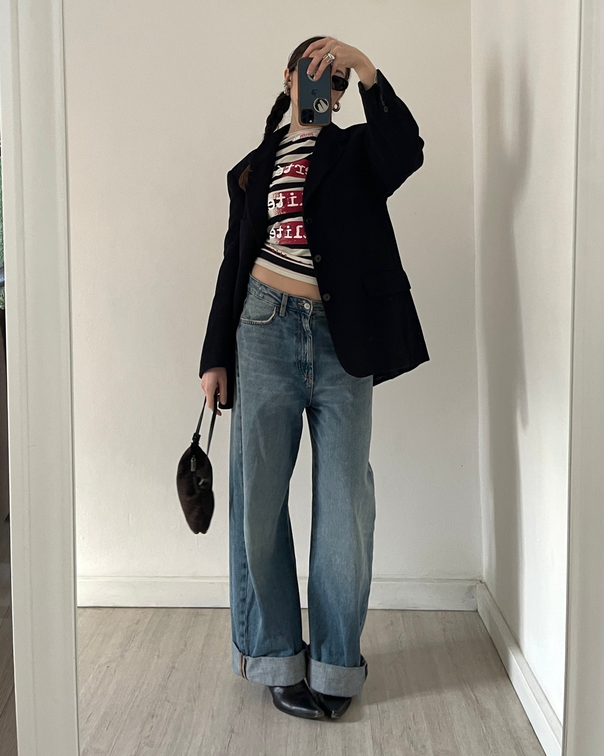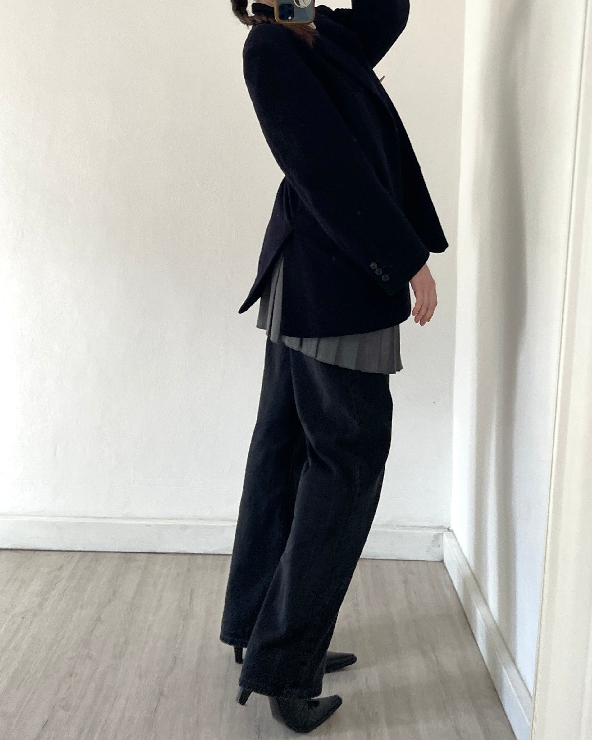 Blazer sartoriale vintage in lana vergine con % di cashmere, fodera interna con taschine, colore blu scurissimo. Nasce originariamente come capo "maschile", ma non risulta rigido/strutturato o oversize. Essenziale nel guardaroba.
