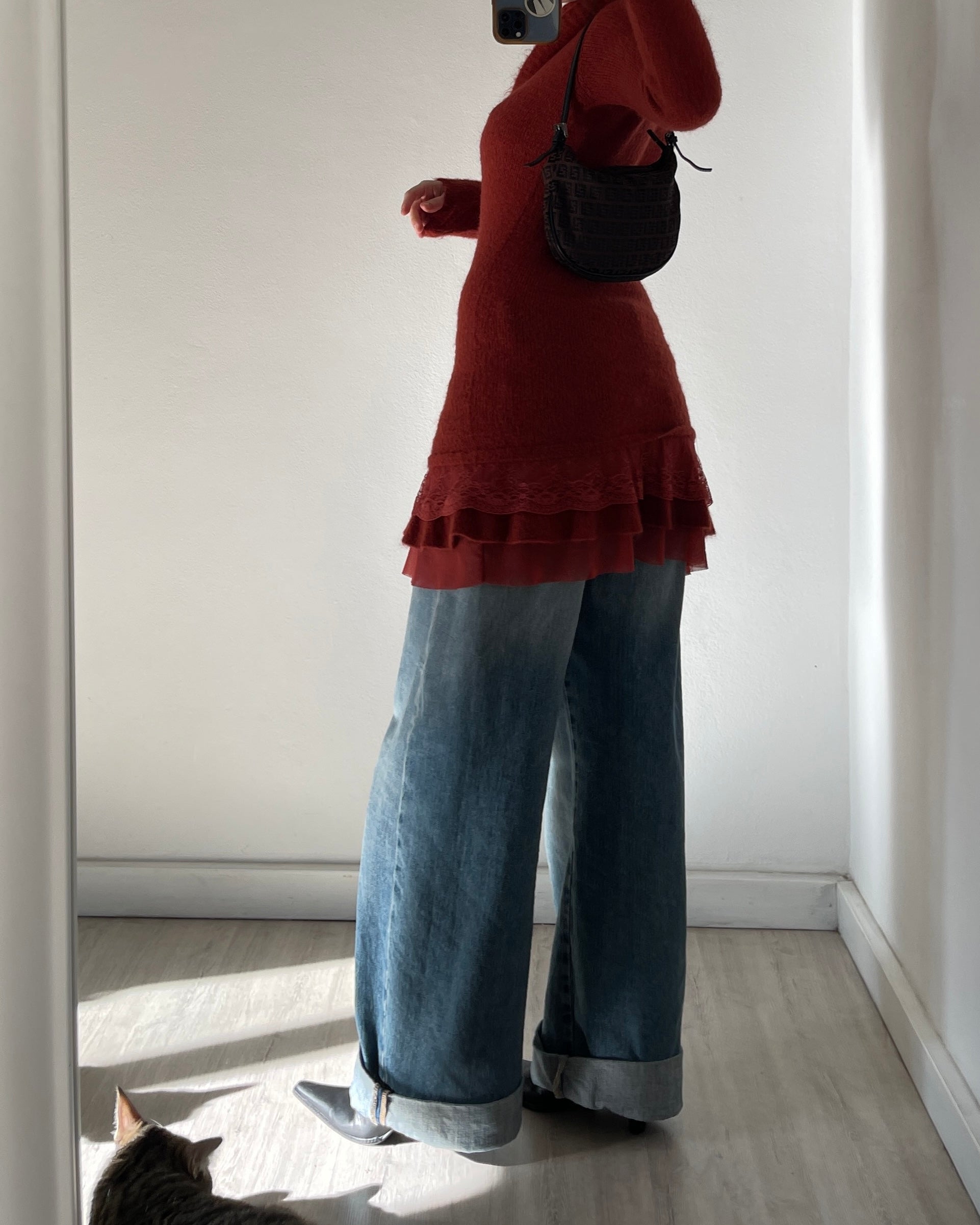 Meraviglioso mini dress in morbidissima lana con dettagli in pizzo e volants, scollatura regolabile ( a barchetta, spalle scoperte, collo alto fluido), micro fiocchetto (si può rimuovere facilmente). Caldissimo e morbidissimo, qualità fantastica. Perfetto da indossare come maglione lungo o mini dress.