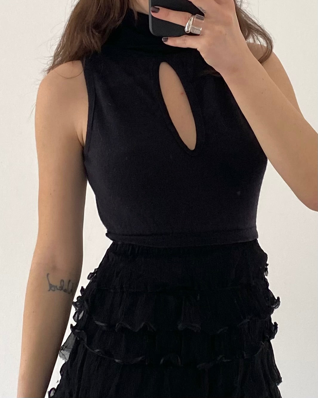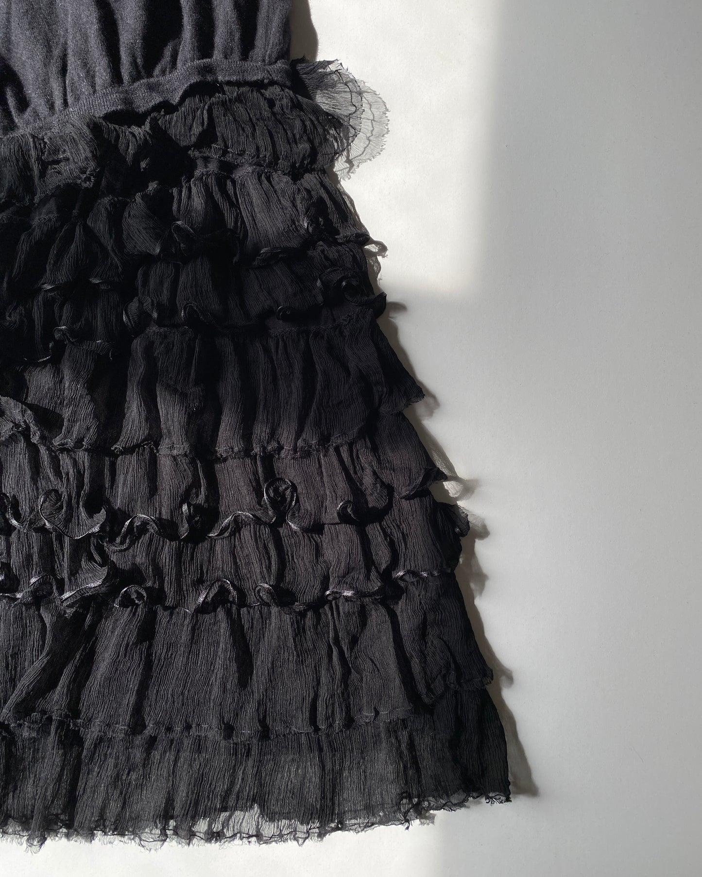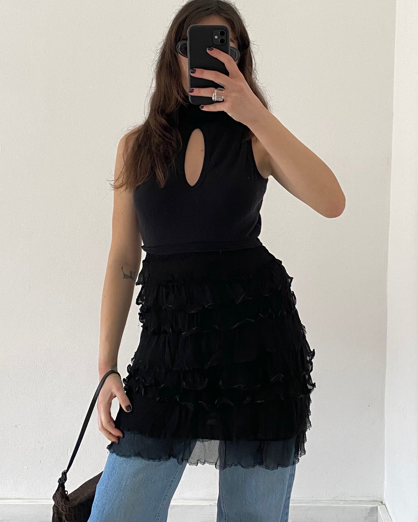 Mini dress in maglia primi anni 2000, gonna svasata con volants, collo alto, fiocchetto in vita e oblò sulla schiena. Può essere indossato anche al contrario con l'apertura sul petto e la maglia è molto fine, quindi va benissimo anche per la primavera/autunno, le balze della gonna sembrano seta, ma è viscosa di ottima fattura. Perfetto da indossare da solo come mini dress o come top per giocare con le sovrapposizioni.