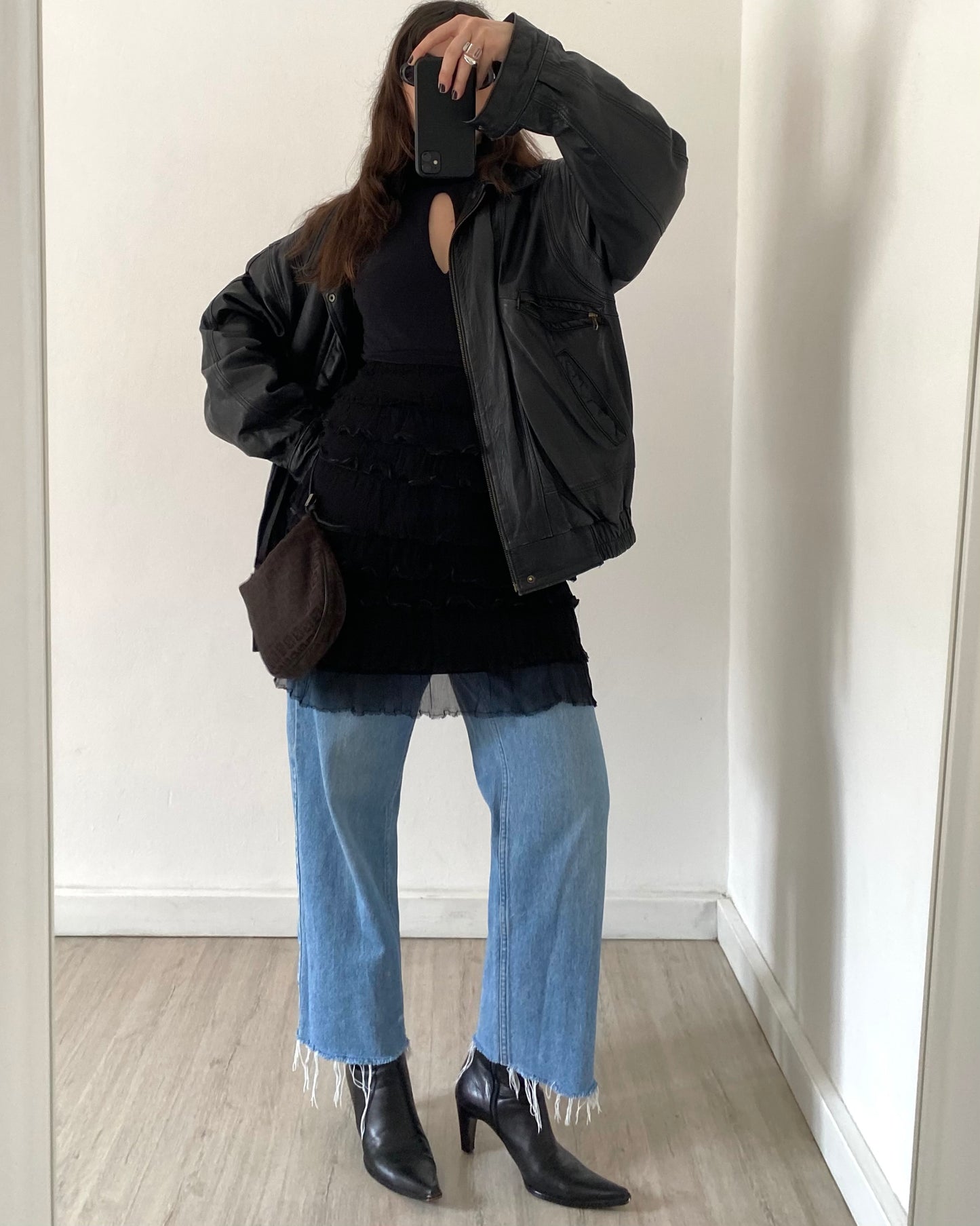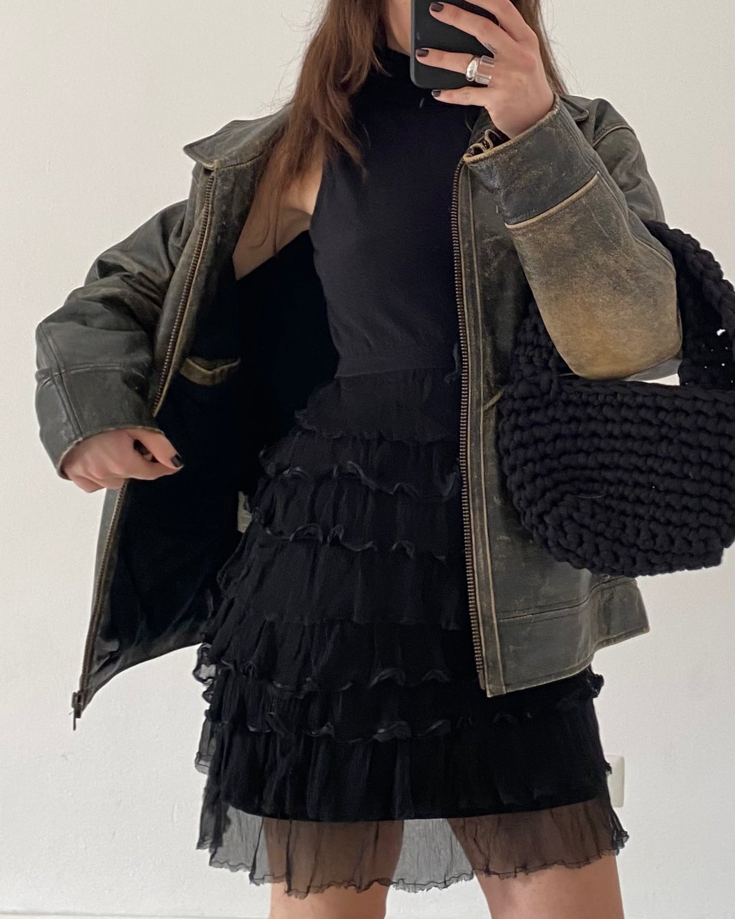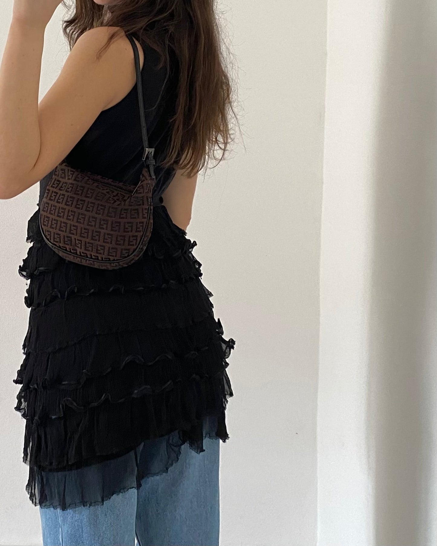 Mini dress in maglia primi anni 2000, gonna svasata con volants, collo alto, fiocchetto in vita e oblò sulla schiena. Può essere indossato anche al contrario con l'apertura sul petto e la maglia è molto fine, quindi va benissimo anche per la primavera/autunno, le balze della gonna sembrano seta, ma è viscosa di ottima fattura. Perfetto da indossare da solo come mini dress o come top per giocare con le sovrapposizioni.