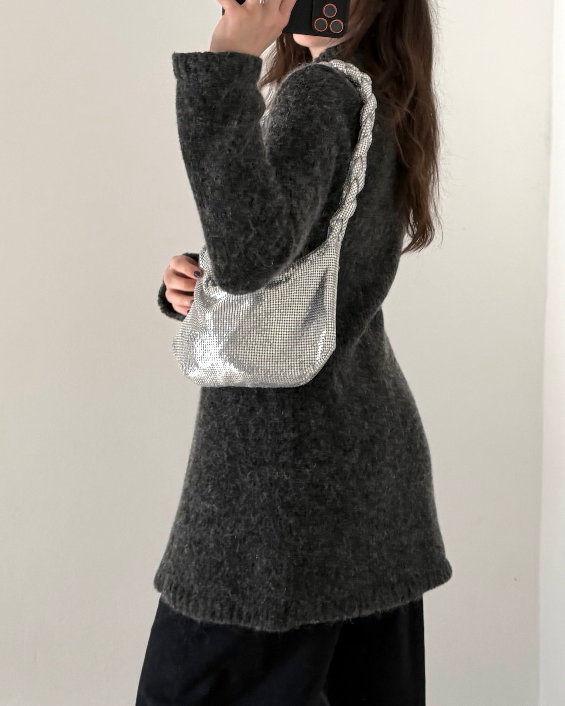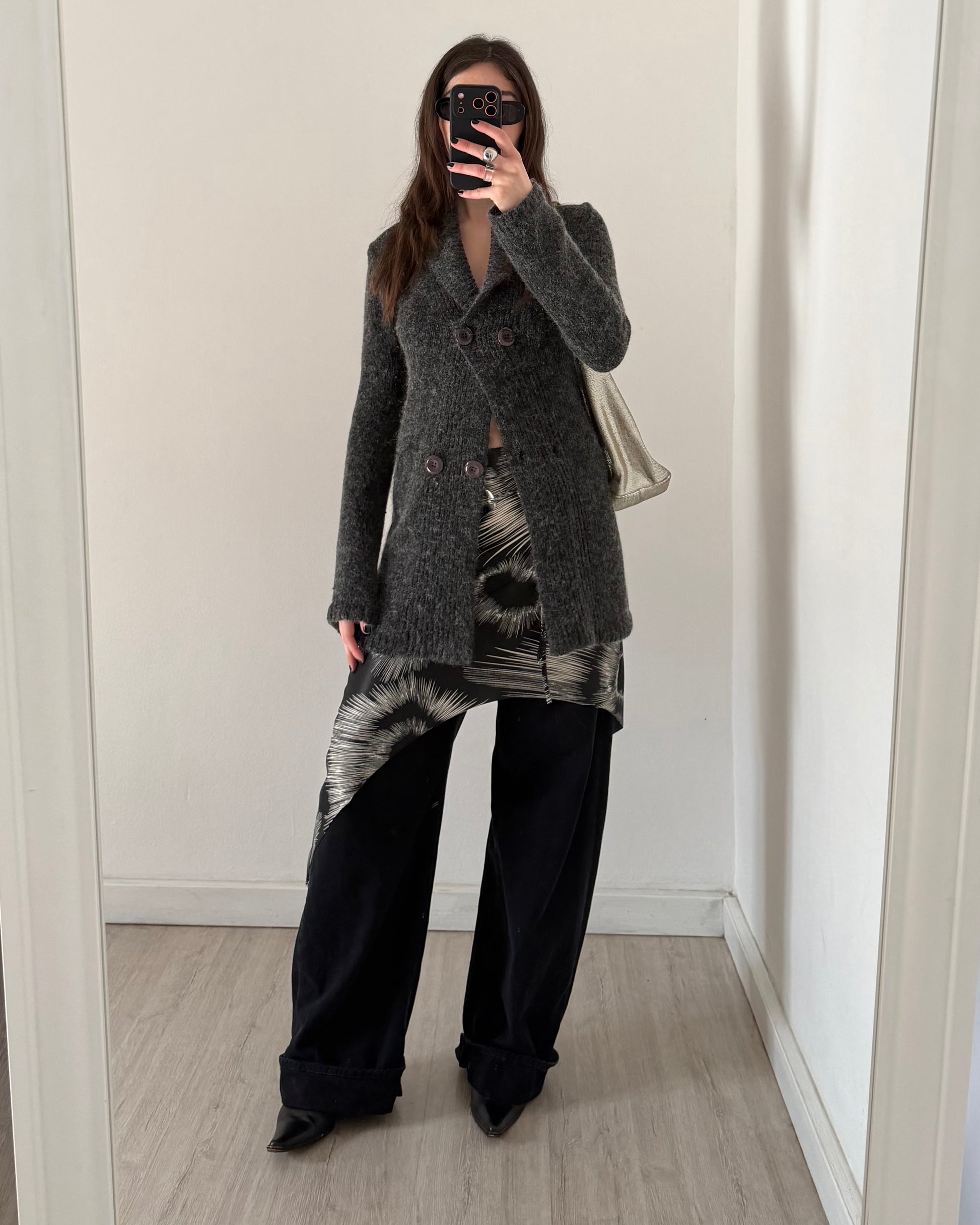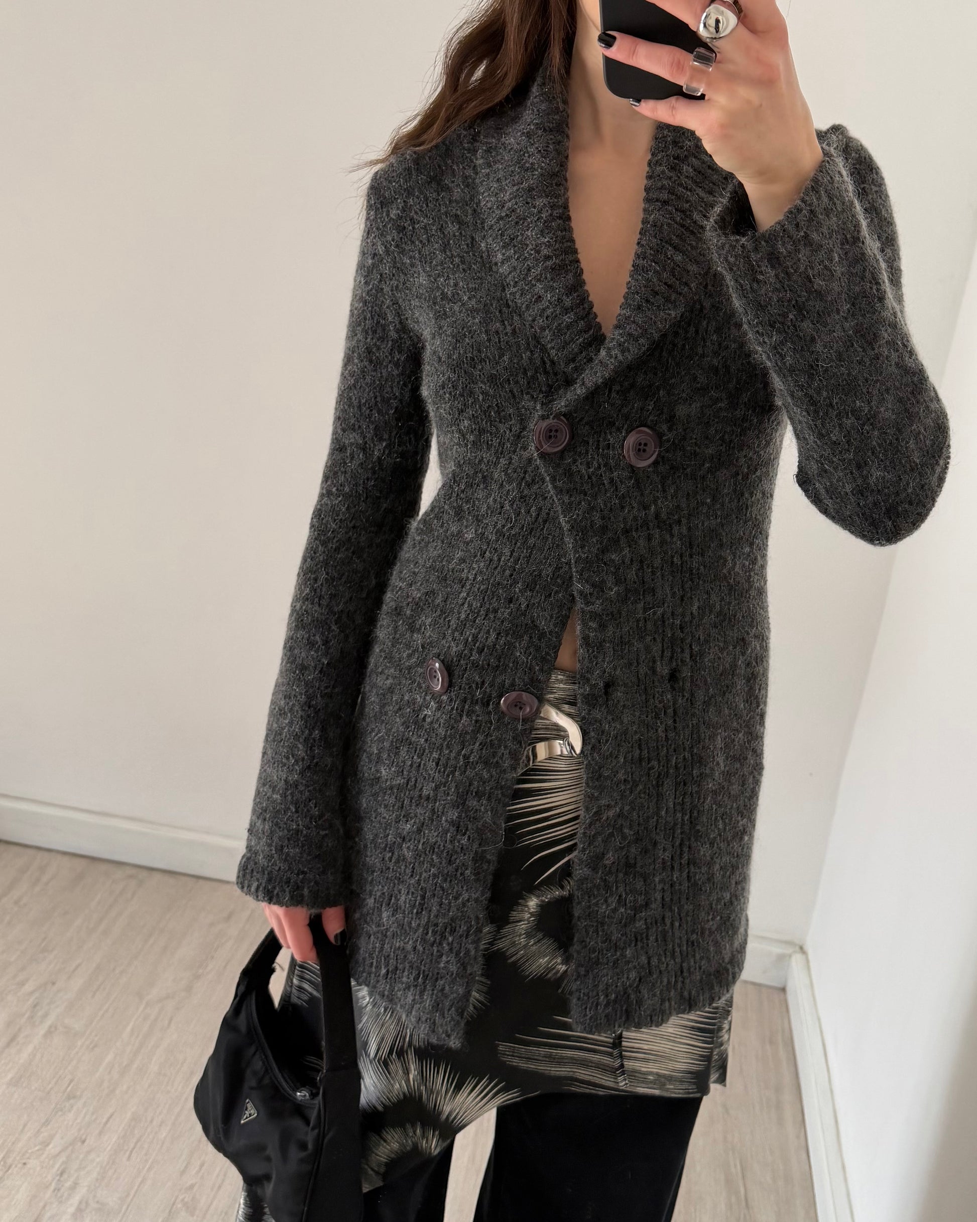 Meraviglioso cardigan anni 2000, lunghezza maxi, chiusura ad incrocio, texture pelosetta, fattura ottima. La piccola % di pregiata alpaca lo rende morbido e caldo.