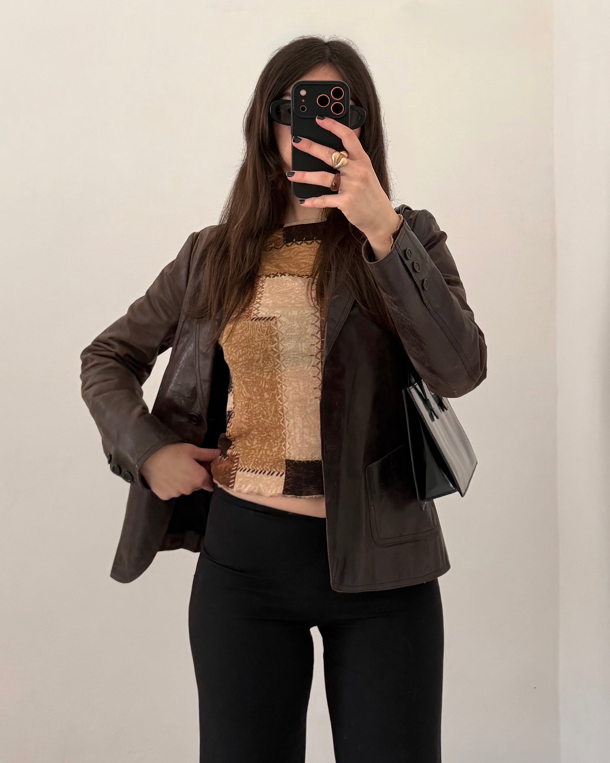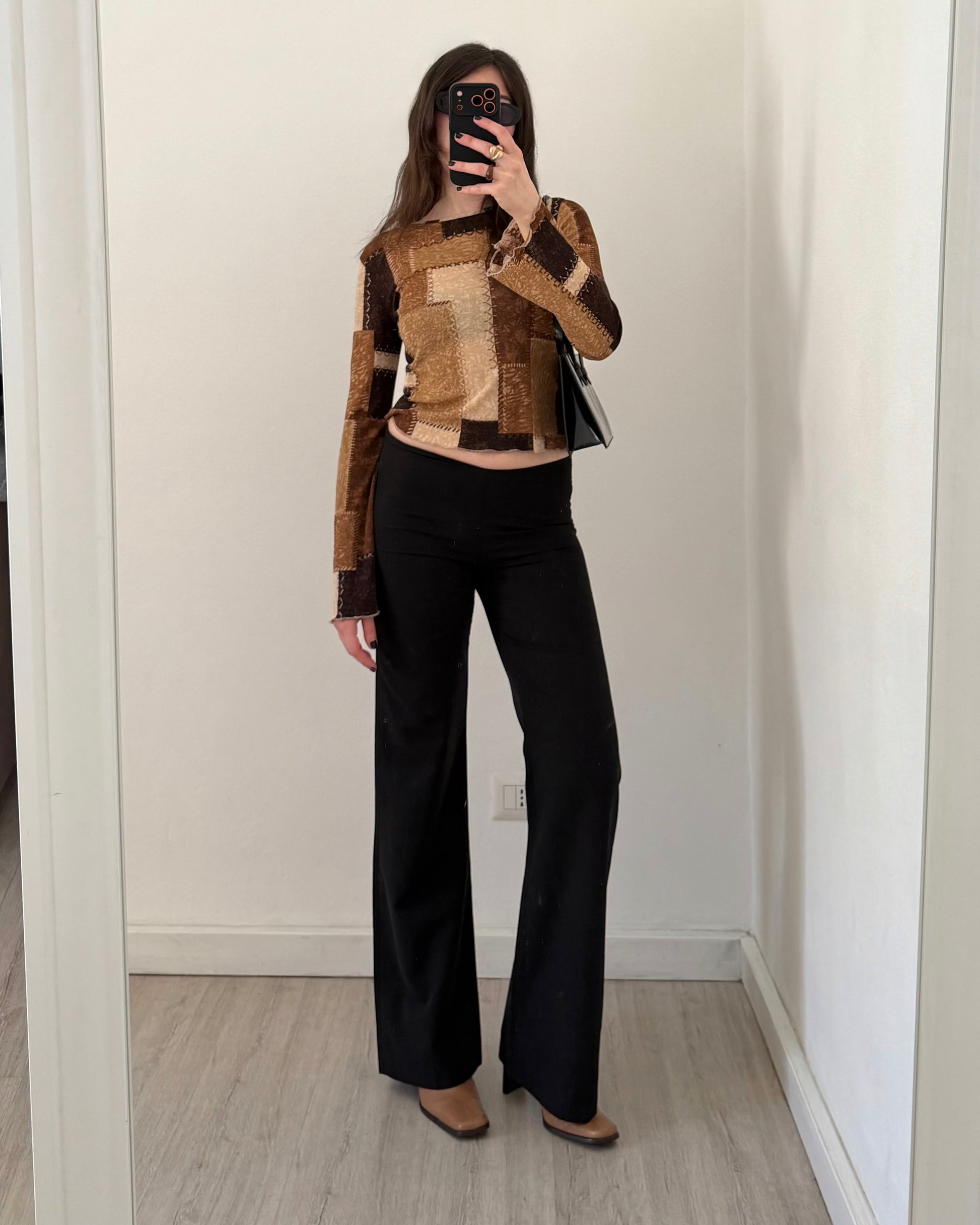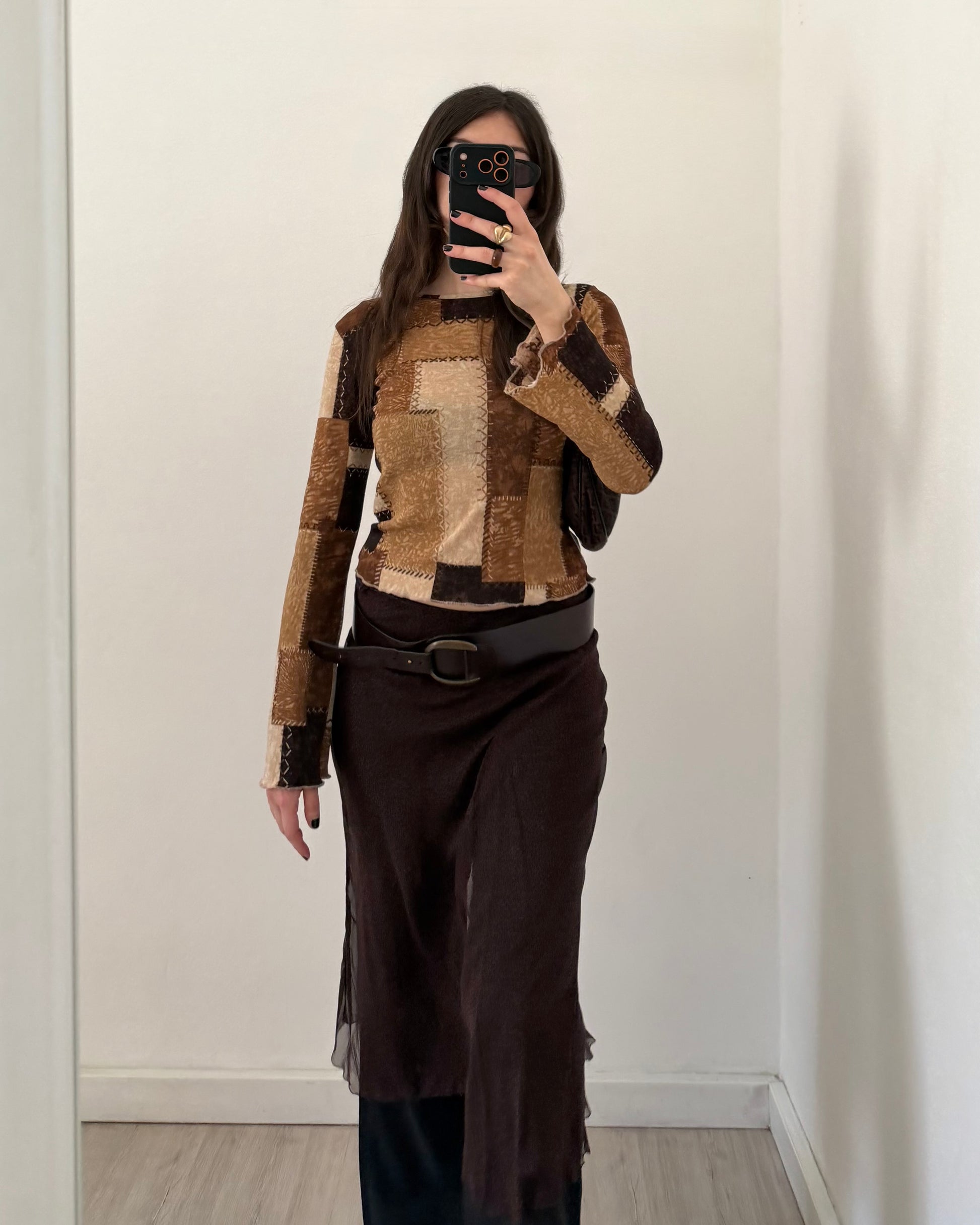 Meraviglioso top maniche lunghe in micro mesh semi trasparente con stampa patchwork. Pezzo raro in pieno stile y2k, etichetta Terranova primissimi anni 2000.