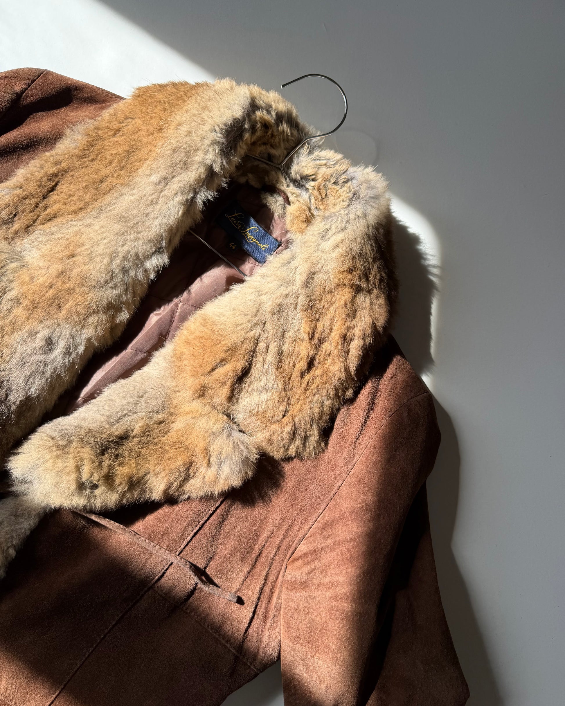 Meravigliosa giacca anni 2000 in camoscio della designer Luisa Spagnoli, modello penny lane in vera pelle-camoscio morbidissimo- con collo, polsi e inserti in pelliccia soffice come una nuvola. Chiusura frontale con laccetti, fodera interna. Qualità fantastica.