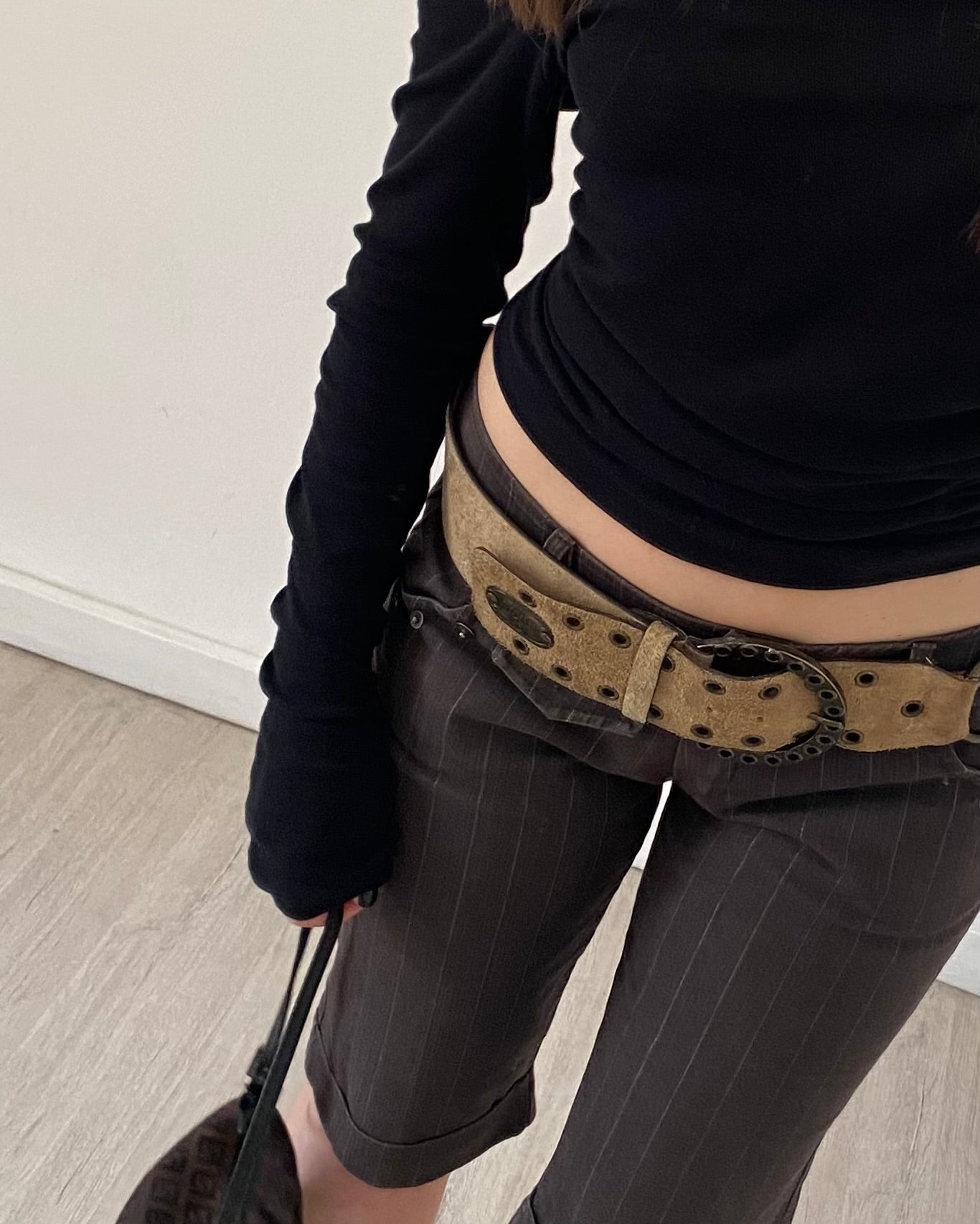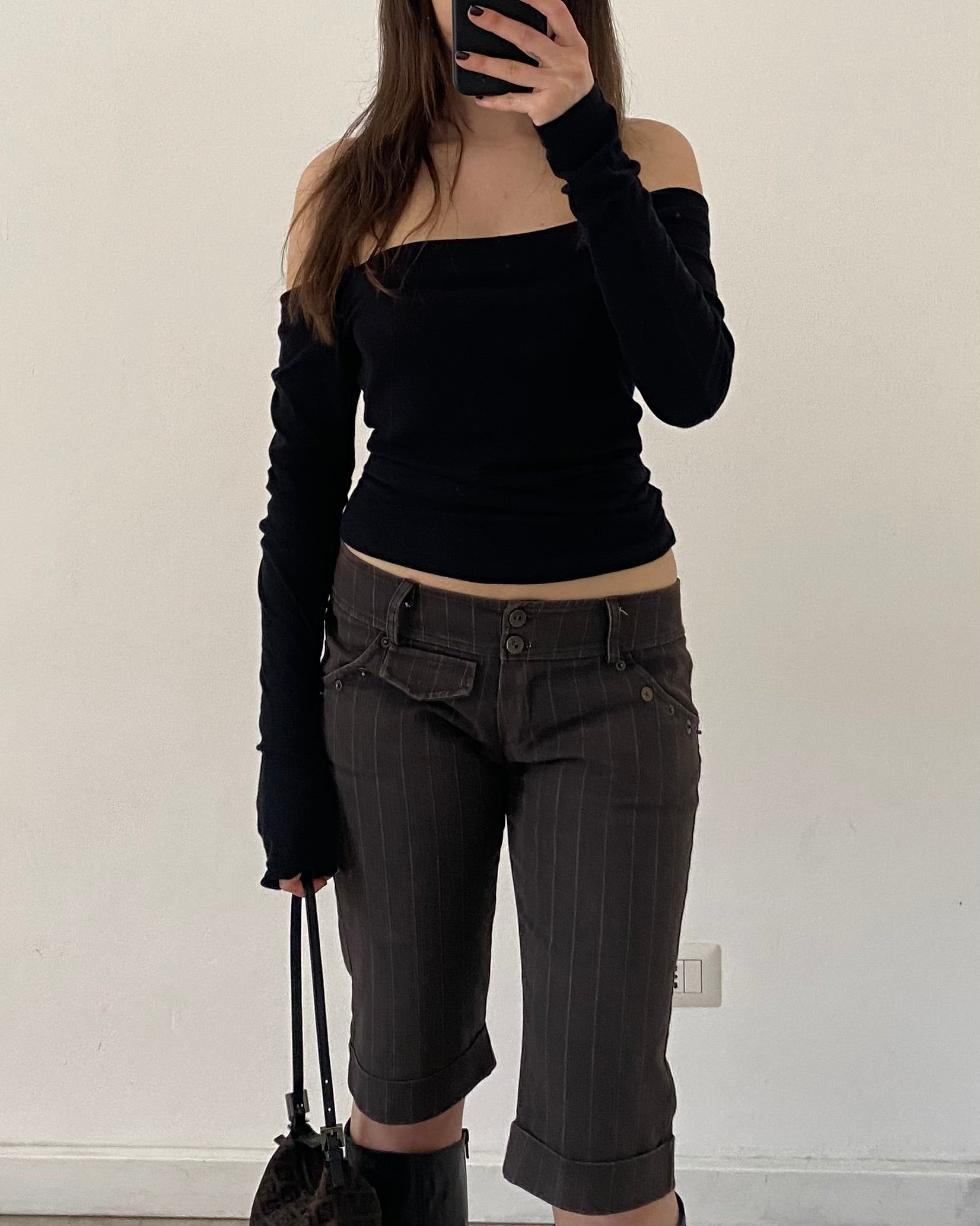 Meravigliosi bermuda anni 2000, denim morbido ed elasticizzato, vita medio-bassa, motivo gessato.