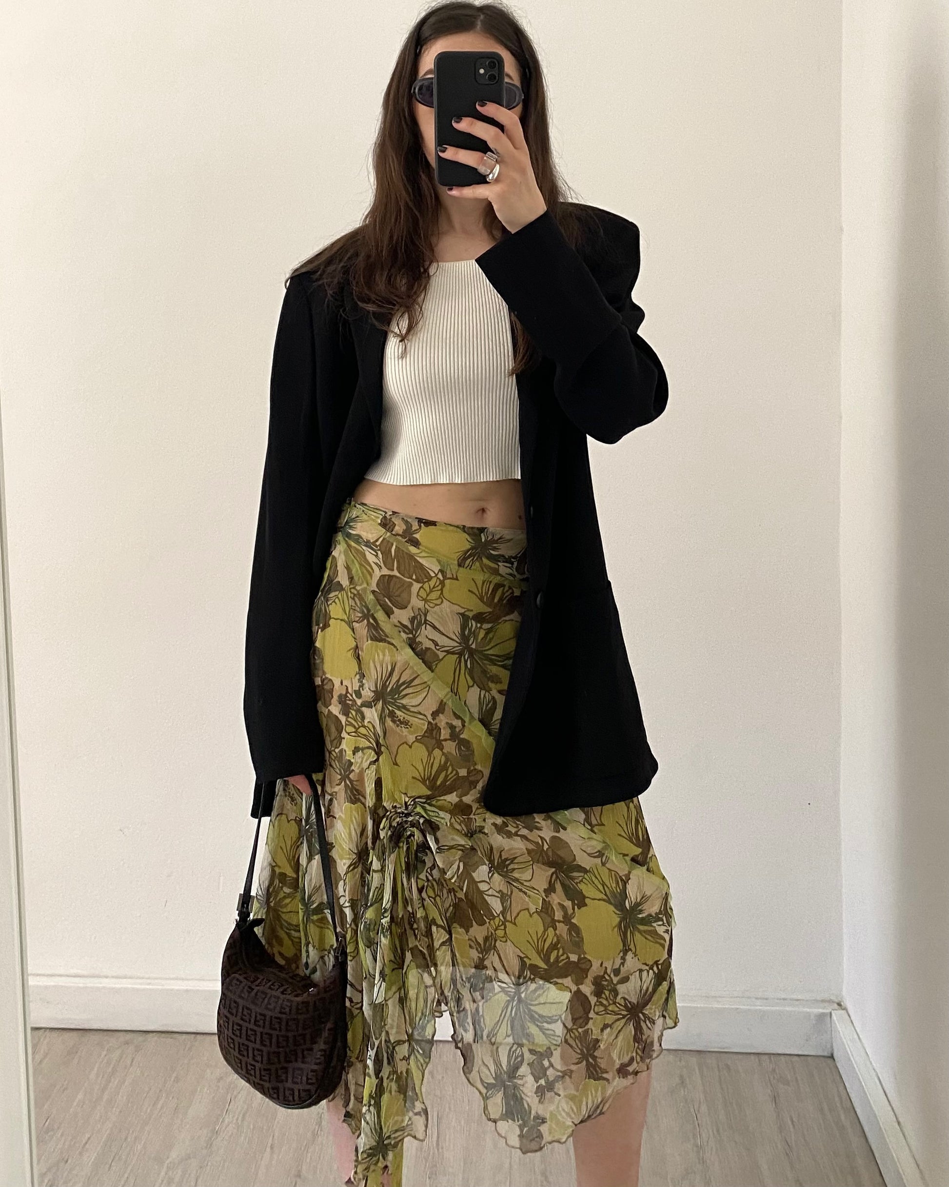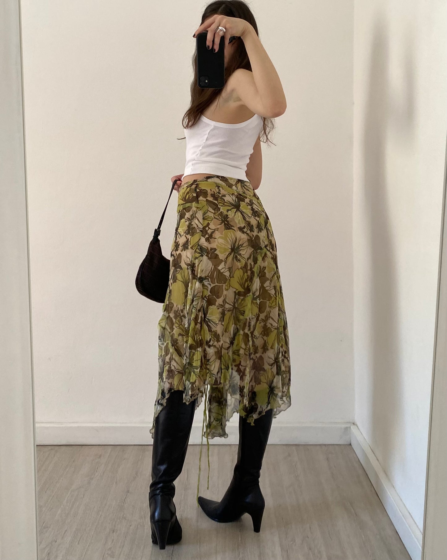 Meravigliosa gonna anni 2000 in pura seta con stampa floreale nei toni del verde, taglio svasato, orlo asimmetrico con volants e arricciatura laterale regolabile con dei laccetti, fodera interna, vita media, chiusura con zip.