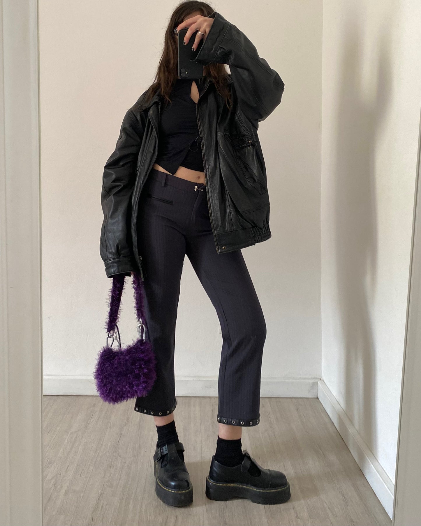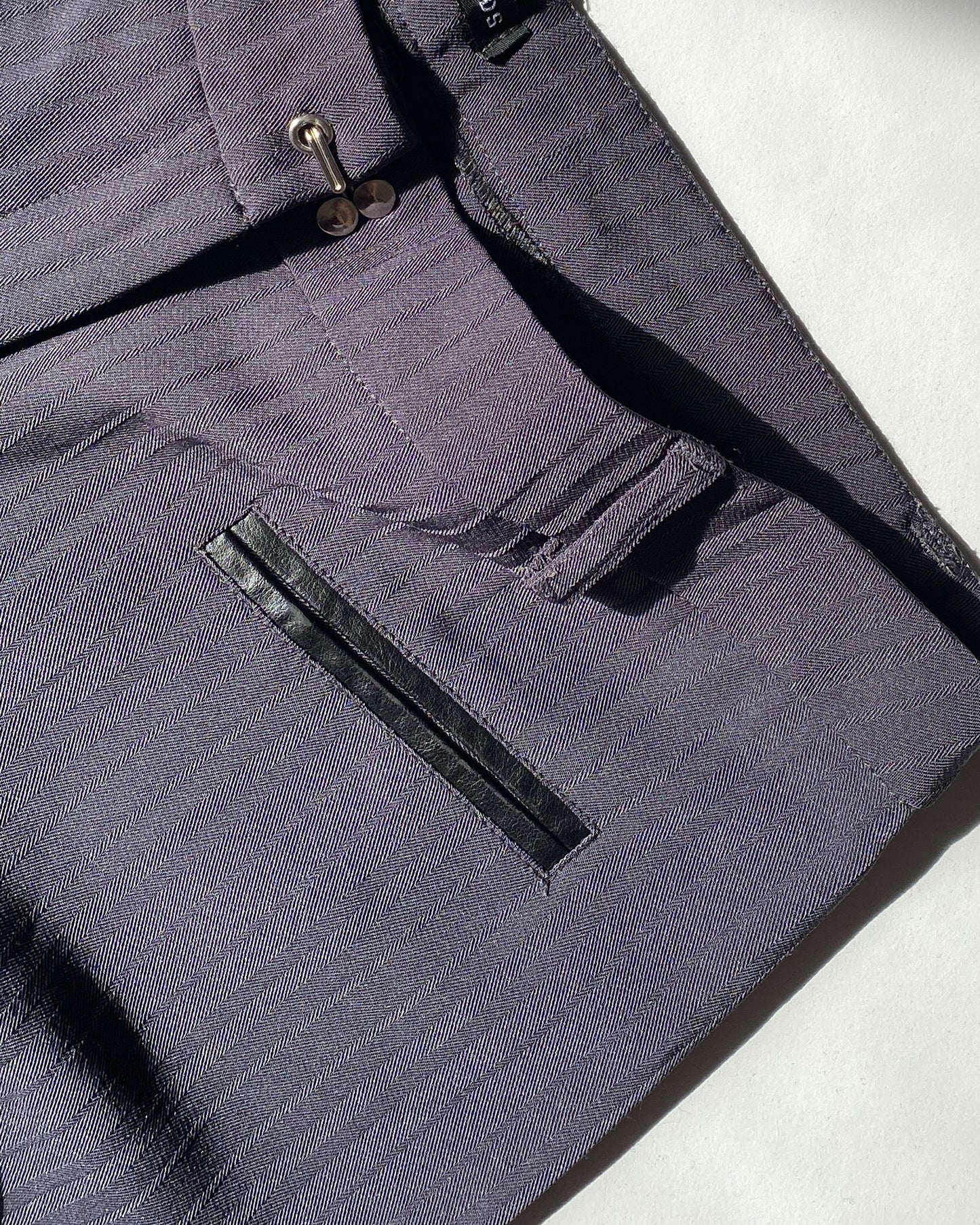 Pantaloni capri primi anni 2000 con gancio in metallo e dettagli con occhielli sulle caviglie, lunghezza crop al polpaccio, vita media, tessuto elasticizzato.