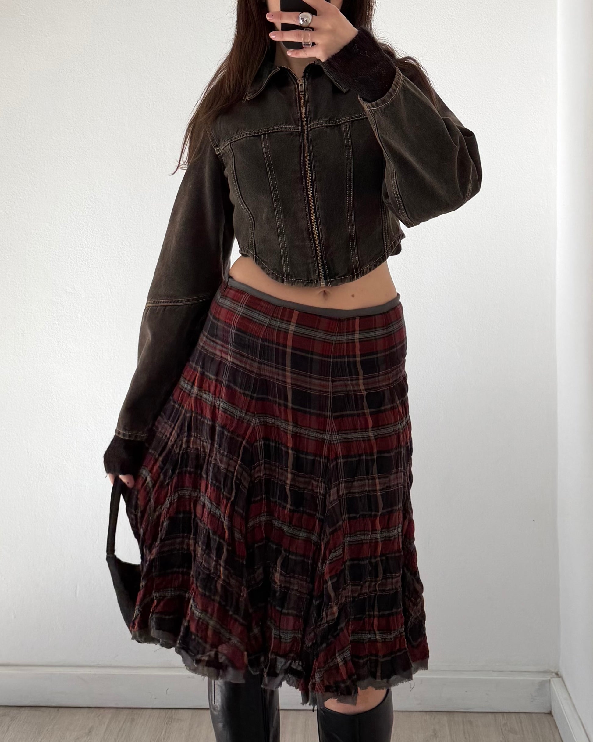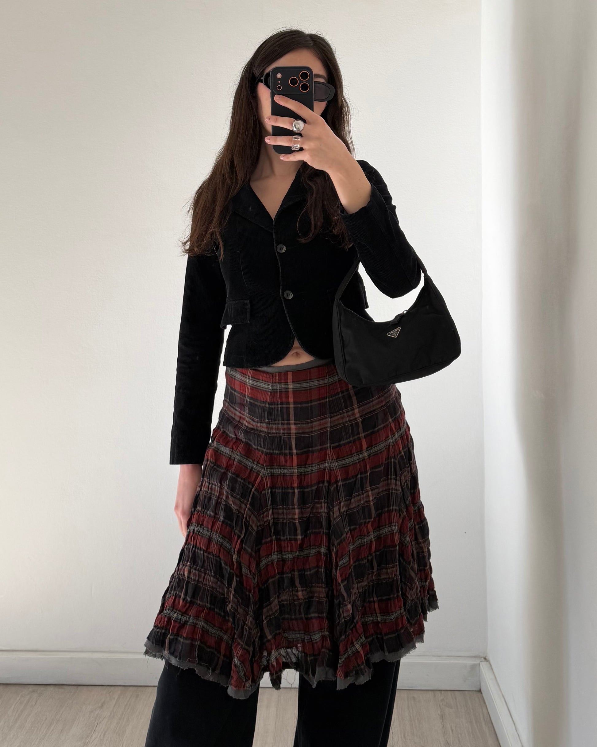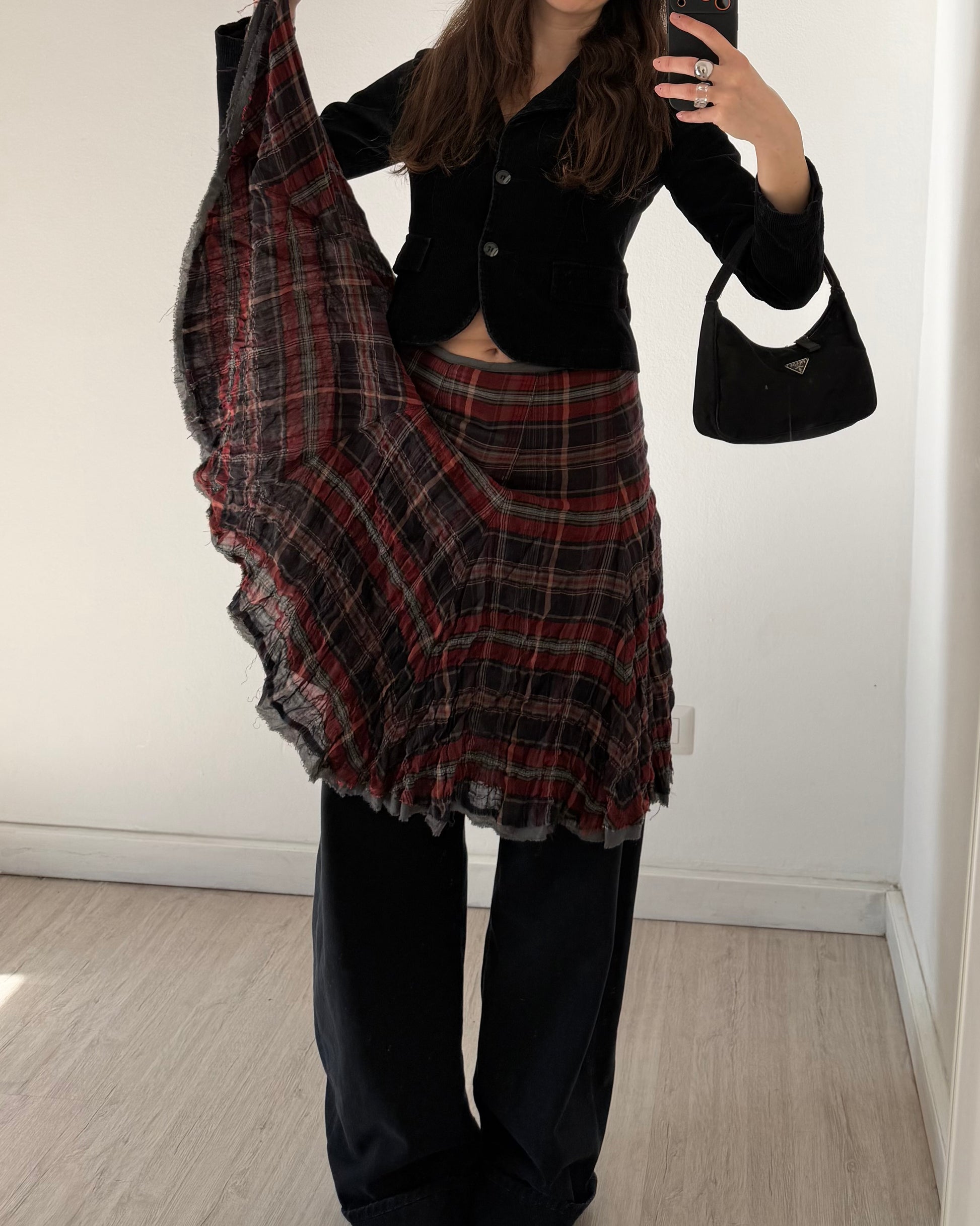 Meravigliosa gonna midi a quadri by Trussardi jeans, chiusura con zip, tessuto doppio strato con effetto "stropicciato".