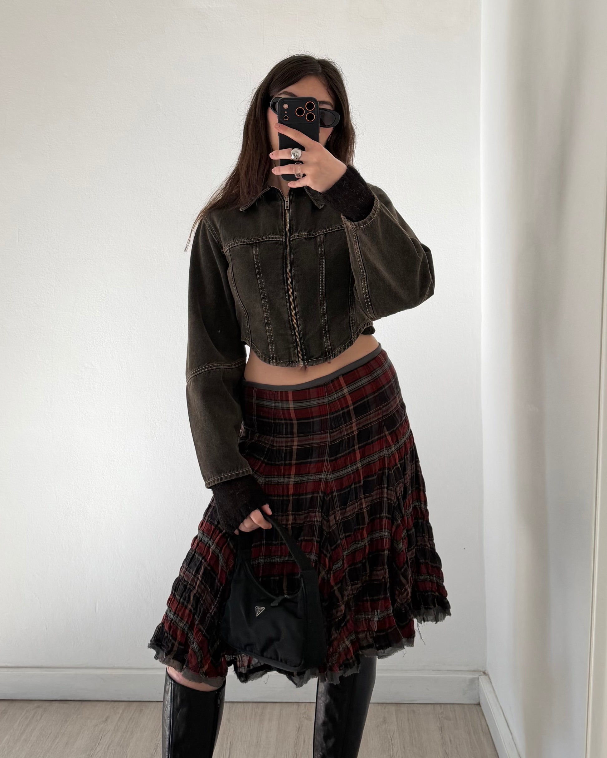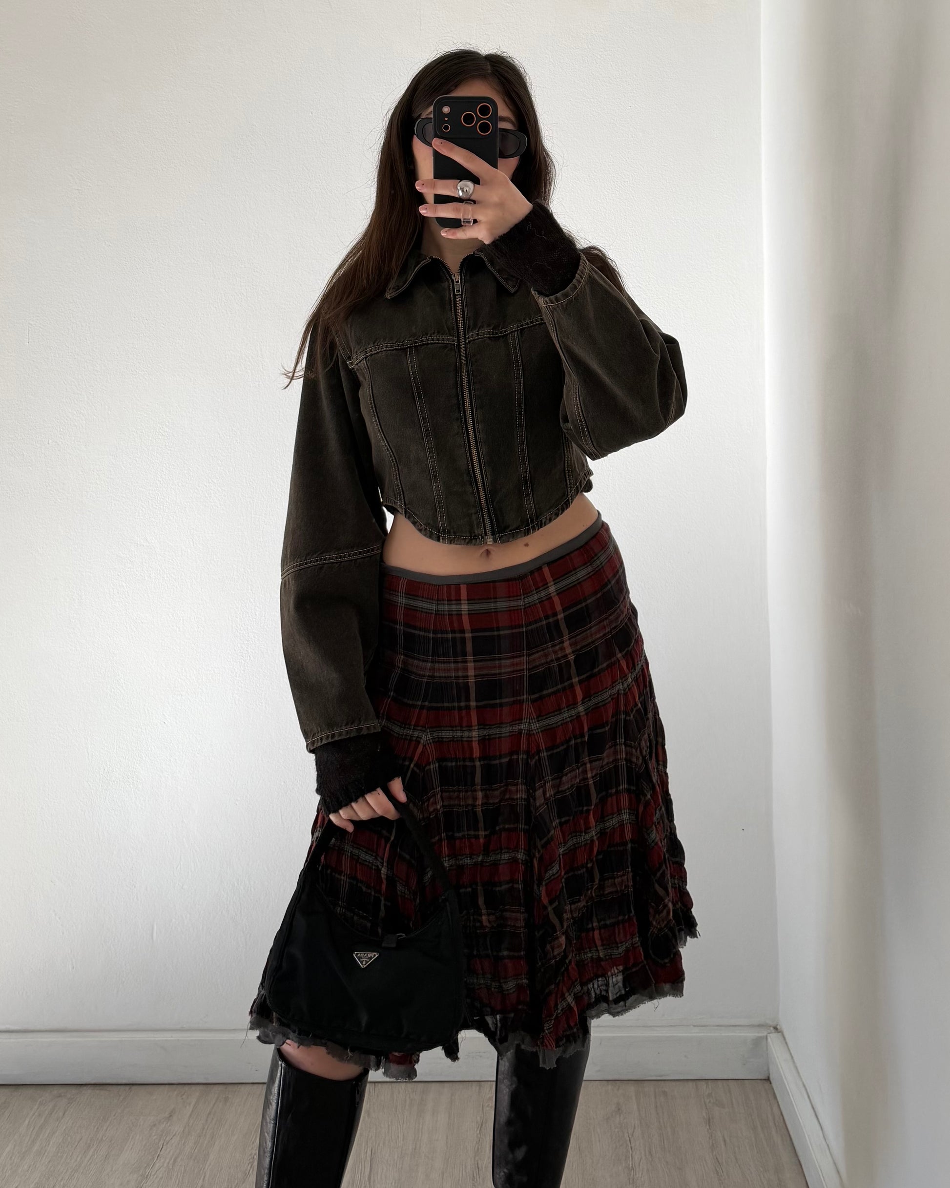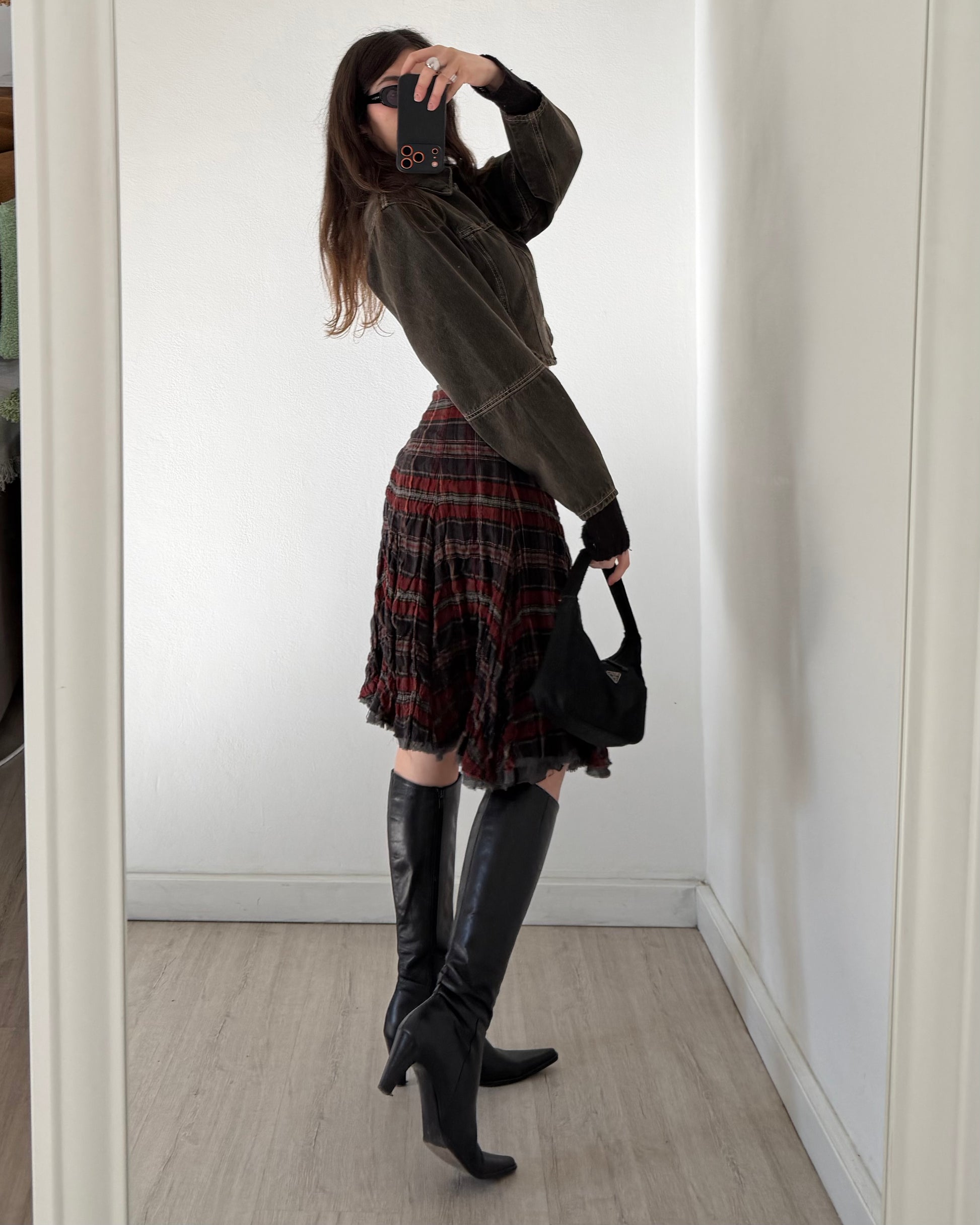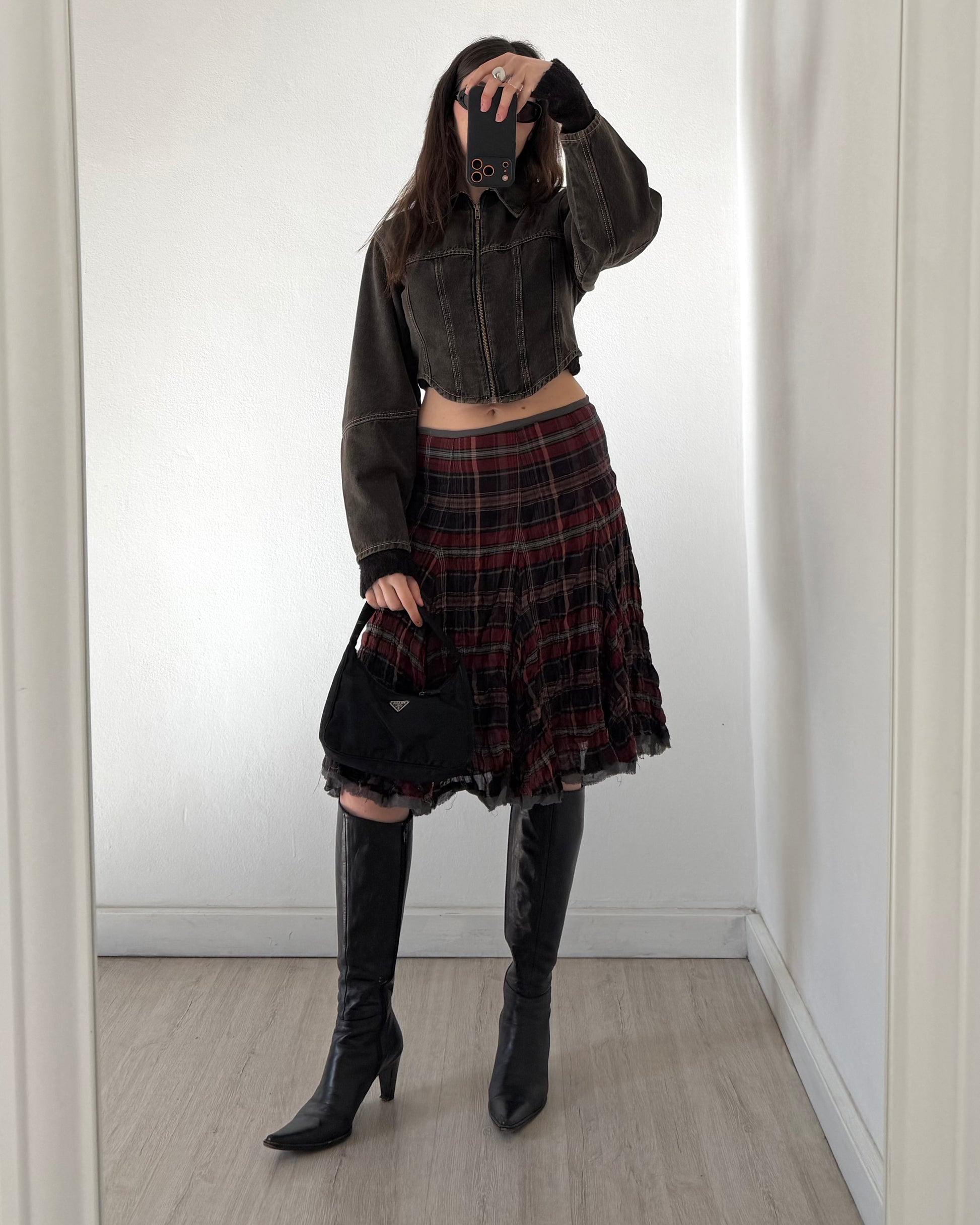 Meravigliosa gonna midi a quadri by Trussardi jeans, chiusura con zip, tessuto doppio strato con effetto "stropicciato".