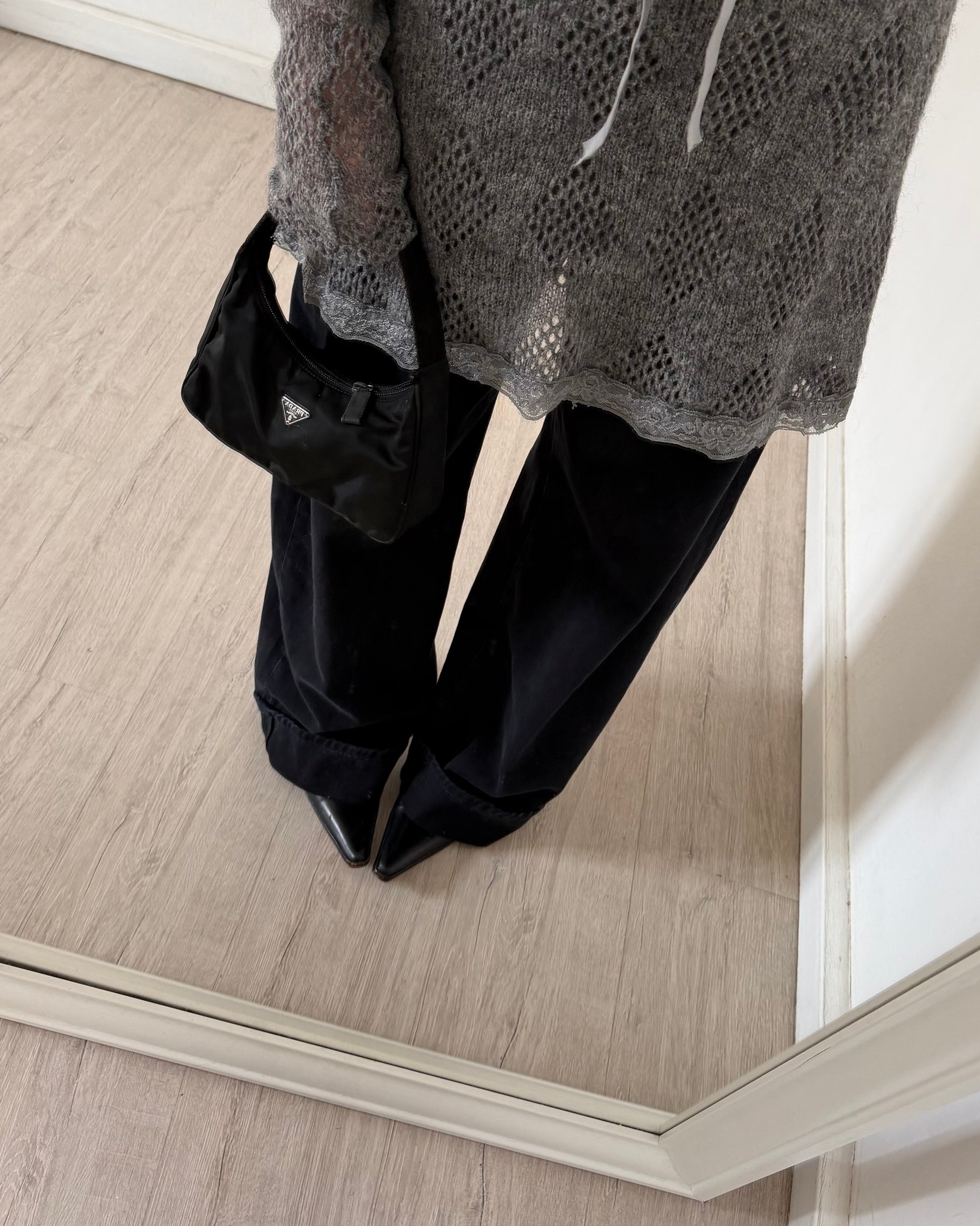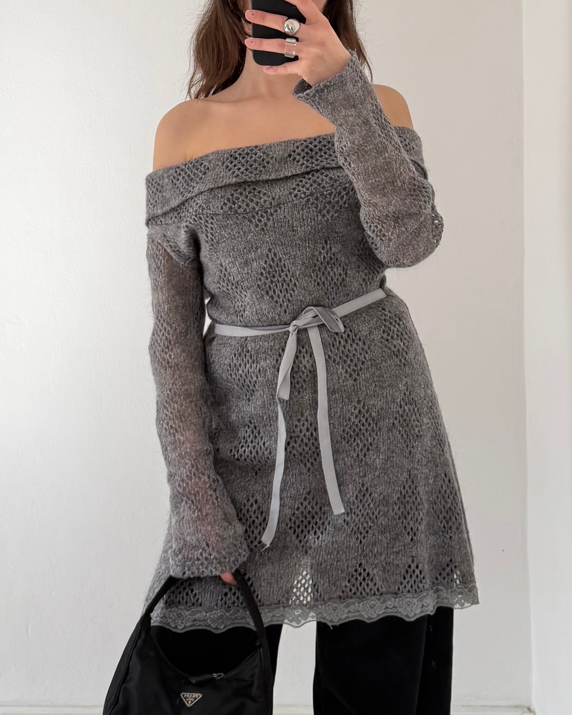 Mini abito anni 2000 in misto lana e mohair con spalle scoperte, maglia traforata con fodera interna, laccetti da annodare in vita. Si può indossare con le spalle scoperte o con la scollatura morbida sul petto.